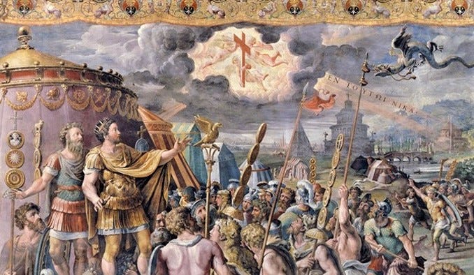 The famous battle where Constantine claims to have seen a vision of the cross as the sign of his victory. At this time, Constantine is an emperor, but not the sole emperor.